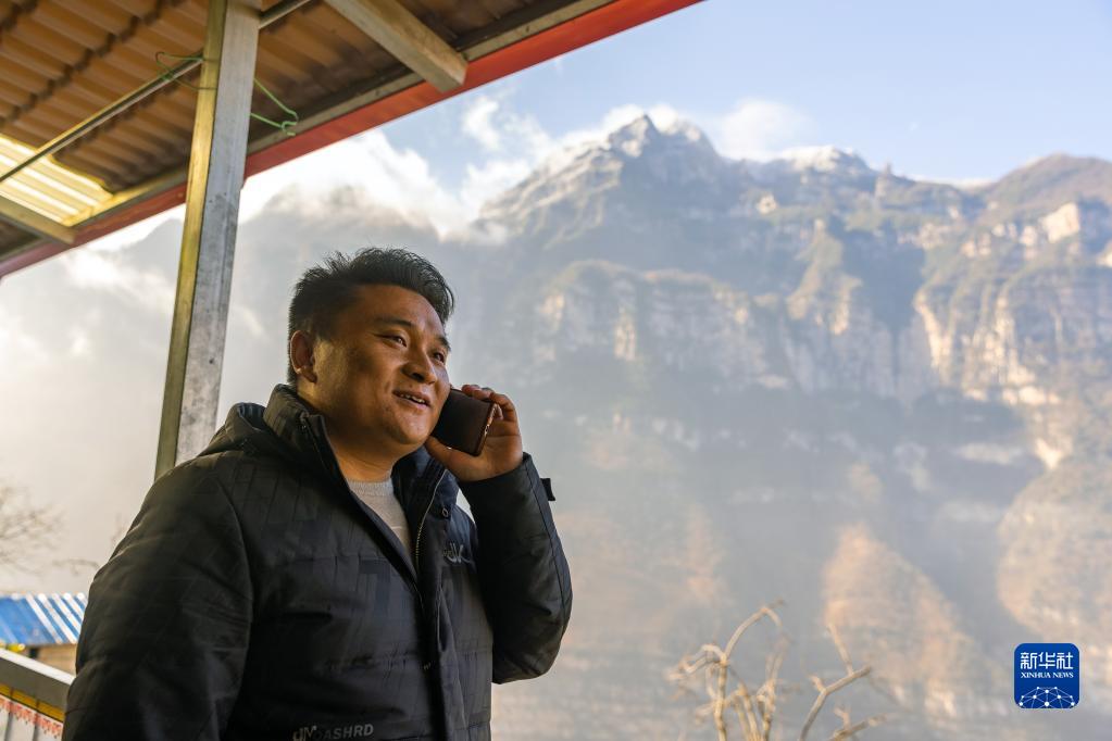 2023年2月14日,在四川省漢源縣永利彝族鄉(xiāng)古路村,鄭望春通過電話與外地游客溝通來村里游覽、住宿的事宜。新華社記者 沈伯韓 攝