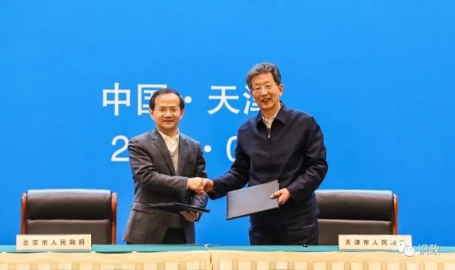 北京市市長(zhǎng)殷勇、天津市市長(zhǎng)張工代表雙方共同簽署《北京市人民政府 天津市人民政府進(jìn)一步加強(qiáng)戰(zhàn)略合作框架協(xié)議》。 圖片來(lái)源:北京日?qǐng)?bào)·識(shí)政