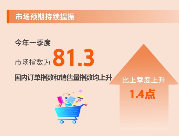 今年以來(lái)經(jīng)濟(jì)循環(huán)加快暢通,市場(chǎng)需求逐步恢復(fù),消費(fèi)勢(shì)頭有所好轉(zhuǎn),市場(chǎng)預(yù)期明顯恢復(fù)。一季度,市場(chǎng)指數(shù)為81.3,環(huán)比上升1.4點(diǎn)。所調(diào)查的8個(gè)行業(yè)中,國(guó)內(nèi)訂單指數(shù)和銷售量指數(shù)均上升,7個(gè)行業(yè)銷售價(jià)格指數(shù)上升。