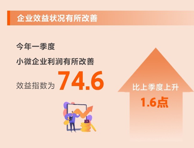 企業(yè)生產(chǎn)經(jīng)營(yíng)加速恢復(fù),原材料價(jià)格漲幅收窄,以及延續(xù)優(yōu)化減稅降費(fèi)政策減輕企業(yè)負(fù)擔(dān),小微企業(yè)利潤(rùn)有所改善。一季度,效益指數(shù)為74.6,比上季度上升1.6點(diǎn),反彈幅度較大,但仍處于歷史較低位。所調(diào)查的8個(gè)行業(yè)效益指數(shù)均有所上升。