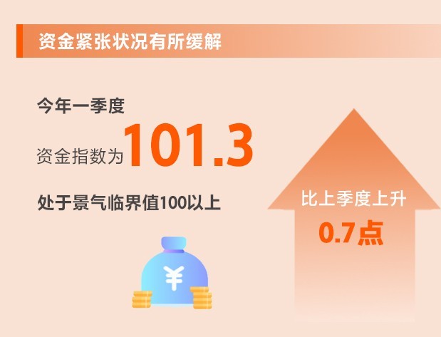 央行降準(zhǔn)以及指導(dǎo)金融機(jī)構(gòu)繼續(xù)支持小微企業(yè),多措并舉“精準(zhǔn)滴灌”,小微企業(yè)融資狀況不斷改善。一季度,資金指數(shù)為101.3,比上季度上升0.7點(diǎn),處于景氣臨界值100以上。其中,流動(dòng)資金指數(shù)為86.3,比上季度上升1.1點(diǎn);融資指數(shù)為90.8,環(huán)比上升0.5點(diǎn)。所調(diào)查的8個(gè)行業(yè)中,8個(gè)行業(yè)流動(dòng)資金指數(shù)、6個(gè)行業(yè)融資指數(shù)均上升。