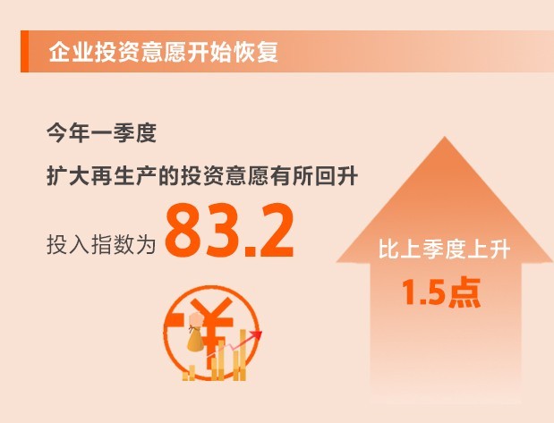 各地投向基礎(chǔ)領(lǐng)域、短板領(lǐng)域、科技創(chuàng)新領(lǐng)域的項(xiàng)目和計(jì)劃增多,企業(yè)對(duì)未來(lái)的信心有所增強(qiáng),擴(kuò)大再生產(chǎn)的投資意愿有所回升。一季度,投入指數(shù)為83.2,比上季度上升1.5點(diǎn),所調(diào)查的8個(gè)行業(yè)投入指數(shù)均上升。