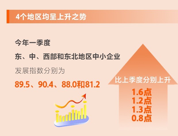一季度,東、中、西部和東北地區(qū)中小企業(yè)發(fā)展指數(shù)分別為89.5、90.4、88.0和81.2,比上季度分別上升1.6、1.2、1.3和0.8點(diǎn),東部地區(qū)指數(shù)上升幅度最大,中部地區(qū)指數(shù)最高,說(shuō)明東部和中部地區(qū)經(jīng)濟(jì)和中小微企業(yè)恢復(fù)較快。