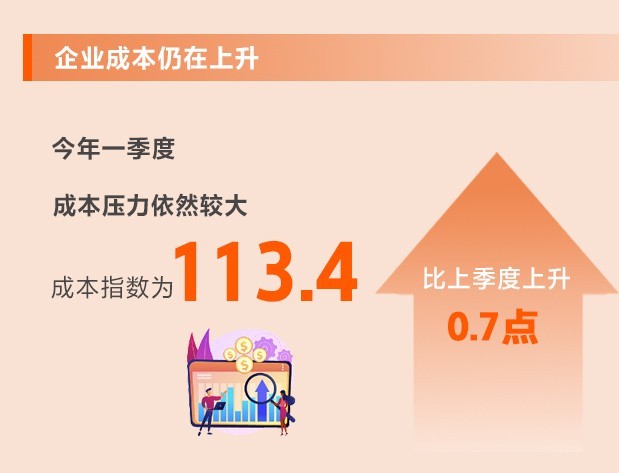 全球通脹仍處于高位,美聯(lián)儲(chǔ)急速加息對(duì)世界經(jīng)濟(jì)影響的外溢效應(yīng)持續(xù)顯現(xiàn)。中小企業(yè)多位于產(chǎn)業(yè)鏈下游且面對(duì)消費(fèi)者,需求疲弱情況下難以轉(zhuǎn)嫁上游原材料價(jià)格上漲的壓力,同時(shí)還面臨人力成本上行以及房屋租金較高等困難。一季度,成本指數(shù)為113.4,比上季度上升0.7點(diǎn),仍處于不景氣區(qū)間,說(shuō)明成本壓力依然較大。所調(diào)查的8個(gè)行業(yè)中,7個(gè)行業(yè)生產(chǎn)成本指數(shù)、8個(gè)行業(yè)勞動(dòng)力成本指數(shù)均上升。
