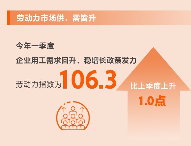 隨著生產(chǎn)生活秩序的恢復(fù),人員流動(dòng)性的提高,企業(yè)用工需求開始回升,同時(shí)穩(wěn)增長(zhǎng)政策持續(xù)發(fā)力,從業(yè)人數(shù)有所上升。一季度,勞動(dòng)力指數(shù)為106.3,比上季度上升1.0點(diǎn)。其中,供應(yīng)指數(shù)為113.6,比上季度上升0.1點(diǎn);需求指數(shù)為98.9,比上季度上升1.9點(diǎn)。