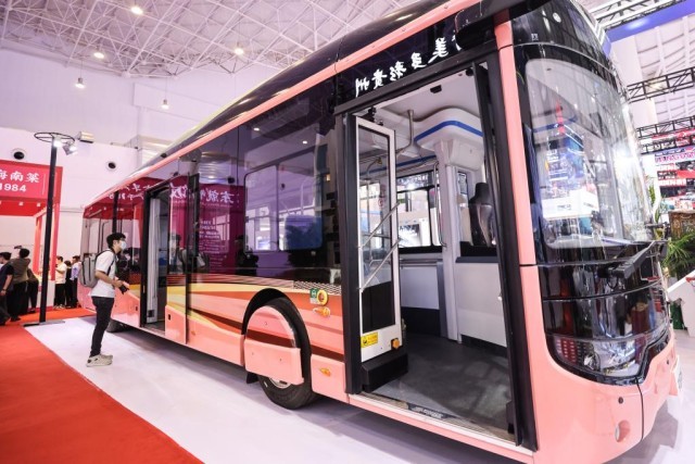 4月11日,觀眾在第三屆消博會(huì)上參觀新能源大巴車。新華社記者張麗蕓 攝