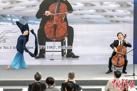 中國(guó)交響樂(lè)團(tuán)大提琴聲部副首席李成和青年舞者湯琪琪在開幕式上表演。中青報(bào)·中青網(wǎng)記者 李雋輝/攝